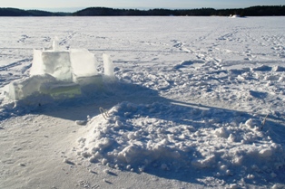 The picture is looking out from the sauna over the North Arm of Burntside Lake.  The little ice wall is built from the ice cut from the hole made for people to dip into the lake from the sauna.  At night (when we perform this crazed ritual) a kerosene lantern sits there, competing with the moon for providing illumination.  The rectangular spot of snow in the right foreground is the “door” covering the hole, snow piled on top, to keep the ice from forming too thickly during the day.  Remember, it’s 20 below zero.